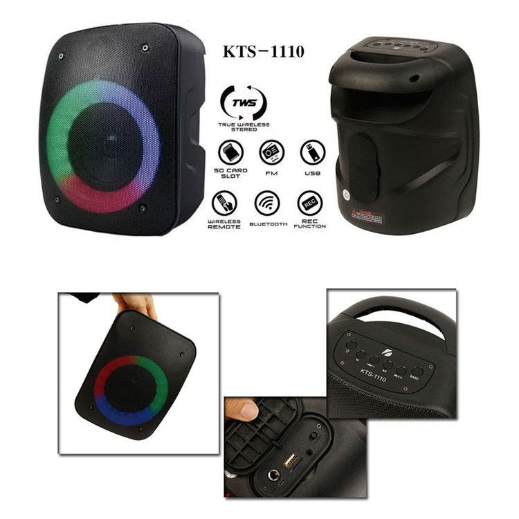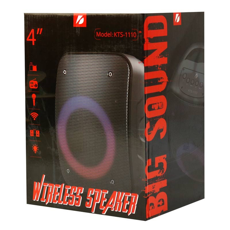 اسپیکر پرتابل KTS 1110 به صورت بی سیم توسط بلوتوث به گوشی های موبایل، تبلت ها و دیگر دستگاه های سازگار متصل می شود و تا شعاع 10 متری بدون هیچ قطعی به پخش آهنگ با صدایی قدرتمند و شفاف می پردازد. علاوه بر این روش های اتصال دیگری شامل رابط جک صوتی 3٫5 میلی متری، شیار حافظه رم میکرو SD، پورت فلش مموری USB و درگاه AUX نیز برای این دستگاه فراهم شده تا دسترسی های بیشتری به انواع فایل های صوتی و آرشیو موسیقی داشته باشید. نورپردازی رنگی RGB نیز در قسمت پنل جلو و بلندگو درنظر گرفته شده که این اسپیکر بی سیم را در محیط های تاریک در هنگام پخش موسیقی جذاب تر می کند. یکی از قابلیت های این پخش کننده صوتی، مجهز بودن به فناوری TWS می باشد که اتصال دو عدد از این اسپیکر هم نوع را به یک دستگاه فراهم می کند تا پس از همگام سازی، صدایی استریو قدرتمندتر از هر دو اسپیکر به صورت همزمان پخش شود. اسپیکر بلوتوثی رم و فلش خور KTS-1110 با درایو 4 اینچی در محدوه فرکانسی پاسخگویی 100 هرتز تا 20 کیلو هرتز و حساسیت سیگنال به نویز 85 دسی بل به تولید صدایی با وضوح فراگیر و استریو می پردازد و با توان خروجی 10 وات قادر است طیف وسیعی از صداهای زیر و بم را باکیفیت بیس قدرتمند و رسا به گوش کاربران برساند. ورودی میکروفون برای این پخش کننده صوتی تعبیه شده که با اتصال میکروفون می توانید یک دستگاه کارائوکه کوچک پرتابل نیز داشته باشید که علاوه بر ضبط صدا برای استفاده در سخنرانی ها، همخوانی با آهنگ ها و … بهره ببرید. مجهز بودن به رادیو FM از دیگر ویژگی های Speaker بی سیم KTS می باشد که با دریافت باکیفیت سیگنال ها بتوانید برنامه های رادیویی را با صدایی شفاف گوش دهید. باتری لیتیومی داخلی با ظرفیت 1200 میلی آمپر ساعت وجود دارد که دوام شارژ آن برای پخش مدوام موسیقی حداکثر 2 ساعت با ولوم 75 درصد ماندگاری خواهد داشت و شارژ خود باتری از طریق پورت میکرو یو اس بی در حدود 3 ساعت زمان می برد.